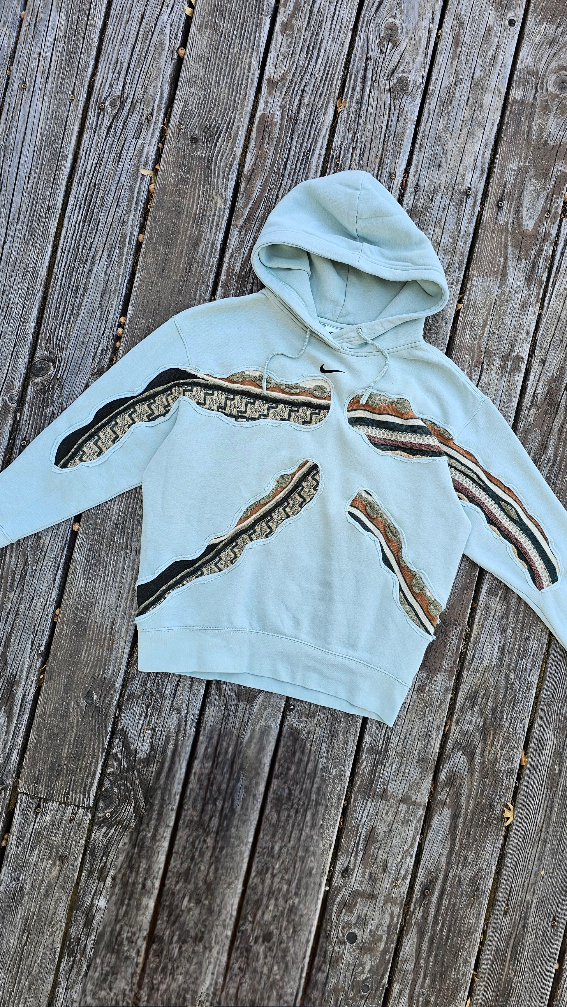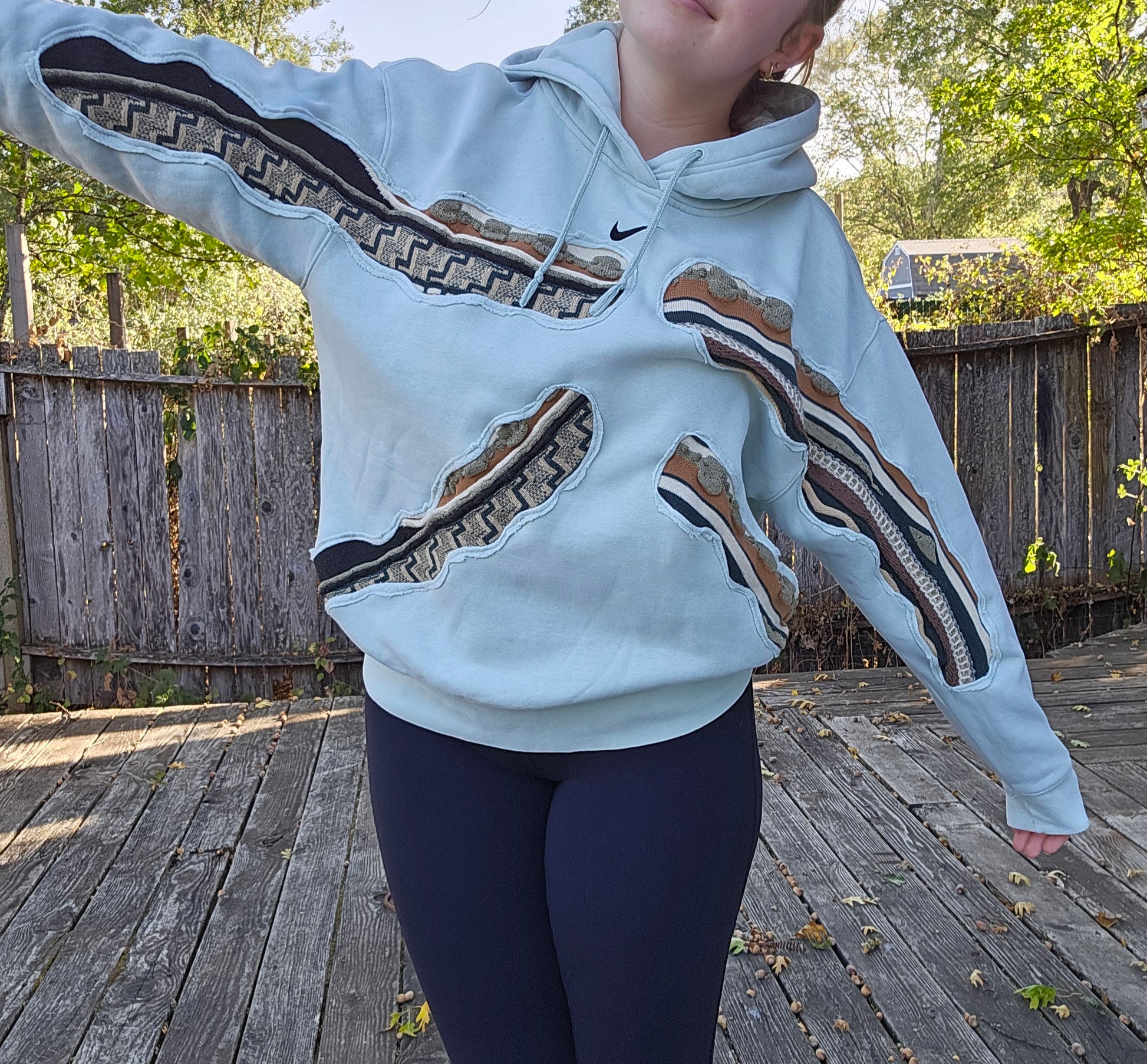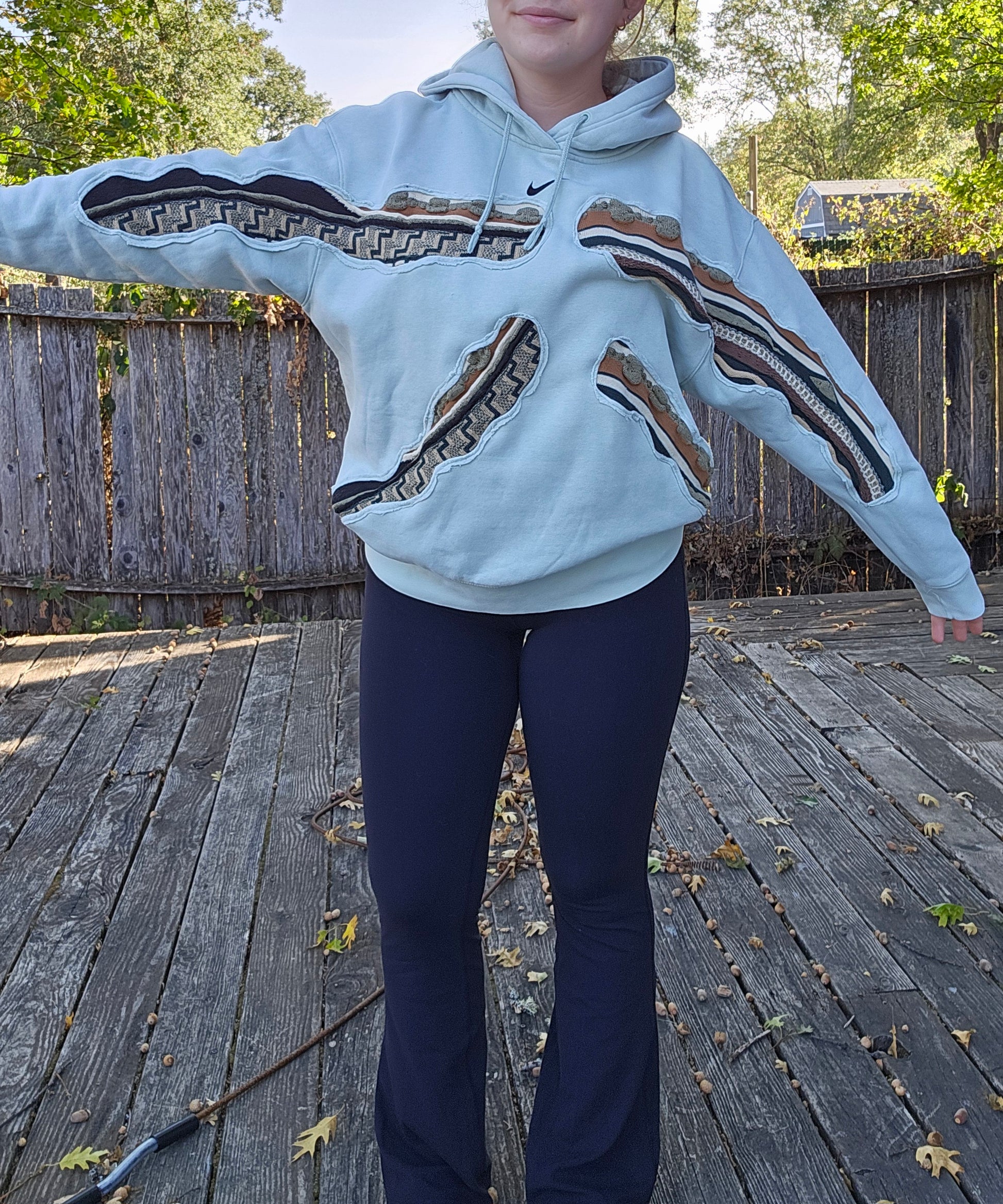 Made from secondhand materials. Please be aware that despite my best attempts to remove damaged areas (stains,holes,piling) from materials used, they may still persist.